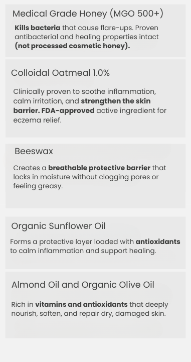 Locks in moisture, supports skin repair, and fights Staph aureus, the bacteria behind baby eczema flare ups.